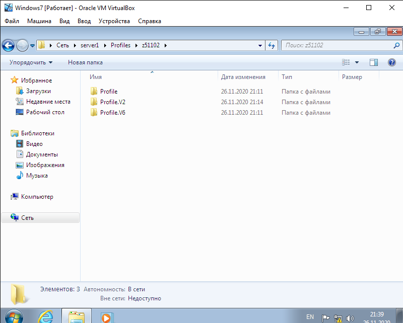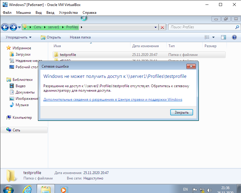 3.7 Убедитесь, зайдя с компьютера-клиента на сервер, что пользователь имеет доступ только к своей папке в каталоге \\server1\Profiles (рисунок 3.4)