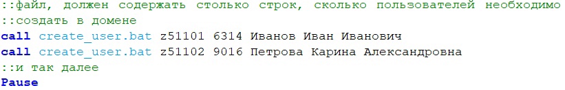 3.3 Как видно из синтаксиса, входными параметрами для выполнения команд из данного файла являются: nazvanieProfilya, parol, fio. В связи с этим, необходимо создать еще один файл students.bat, в котором будут вызываться на исполнение файл create_user.bat с необходимыми параметрами. Пример строк из данного файла приведен ниже: