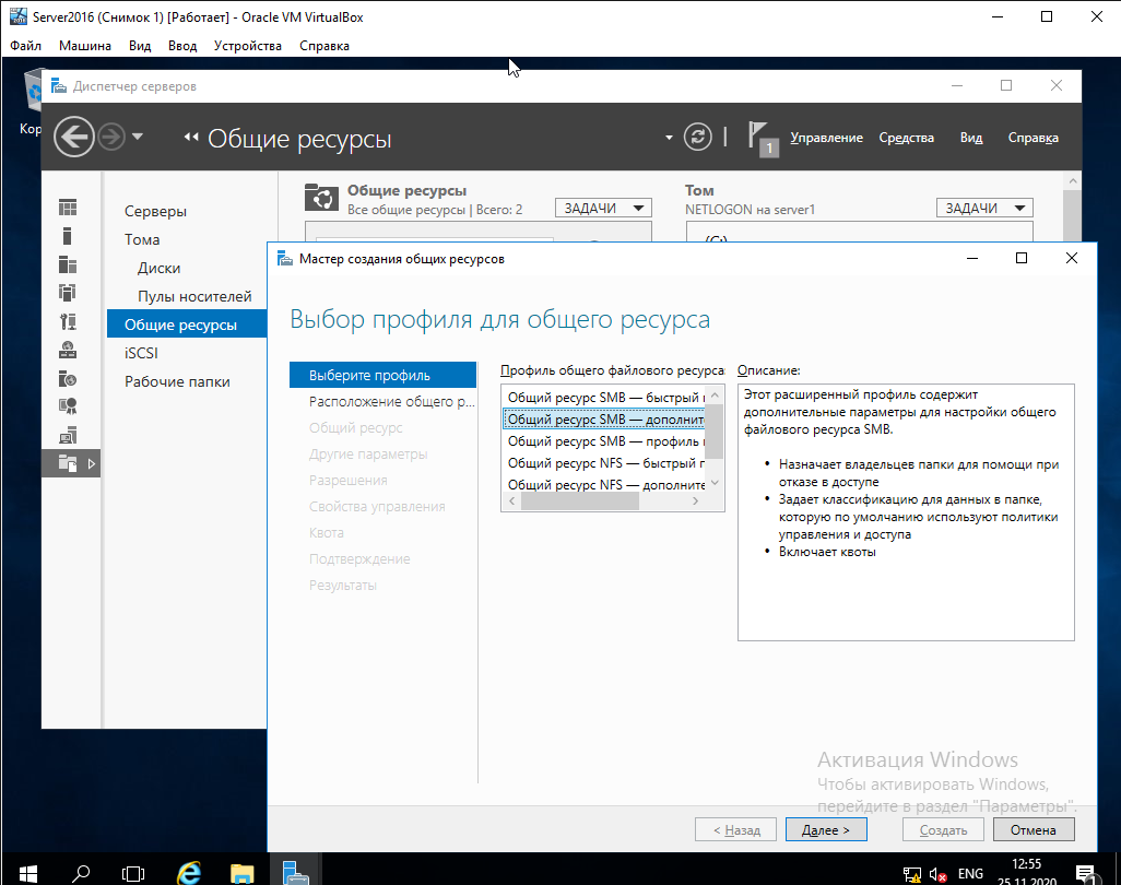 1.2 Откройте диспетчер сервера и перейдите на файловые службы и службы хранилища. Выберите раздел «Общие ресурсы» и добавьте новый общий ресурс (либо с помощью контекстного меню, либо через Задачи → Новый общий ресурс). Профиль ресурса – Общий ресурс SMB – дополнительные (рисунок 1.2)