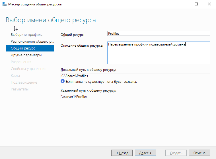 1.3 На шаге «Расположение общего ресурса» оставляем параметры по умолчанию. На шаге «Выбор имени общего ресурса» введите имя ресурса – Profiles (рисунок 1.3).