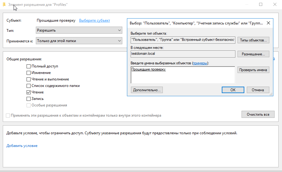 в. добавляем разрешение на чтение для группы «Прошедшие проверку». Для этого в окне «Дополнительные параметры безопасности» на вкладке «Разрешения» нажимаем кнопку «Добавить», а затем кликаем по ссылке «Выберите субъект». В открывшемся окне вводим «Прошедшие проверку» и нажимаем «Проверить имена» → ОК. Устанавливаем разрешение на чтение и применяем его только для этой папки (рисунок 1.4).