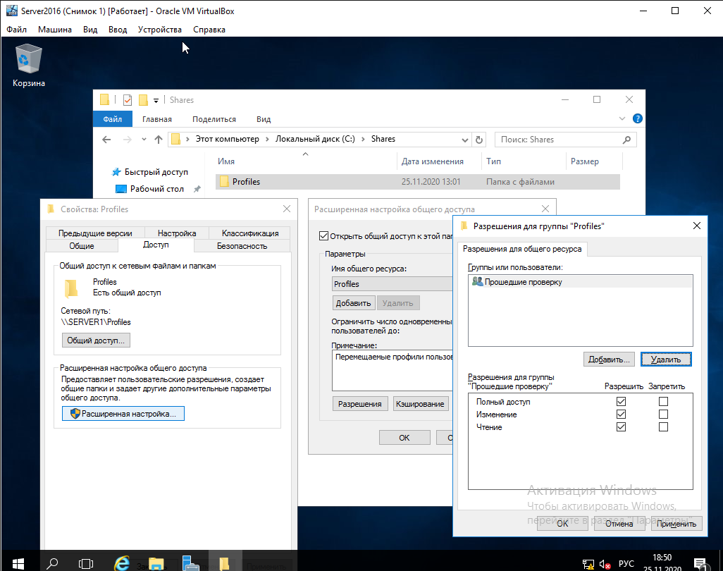 е. откройте проводник и перейдите в свойства созданного каталога Profiles. На вкладке «Доступ» выберите «Расширенная настройка» → «Разрешения». Удалите группу «Все», а затем добавьте группу «Прошедшие проверку» и назначьте ей полный доступ (рисунок 1.5).