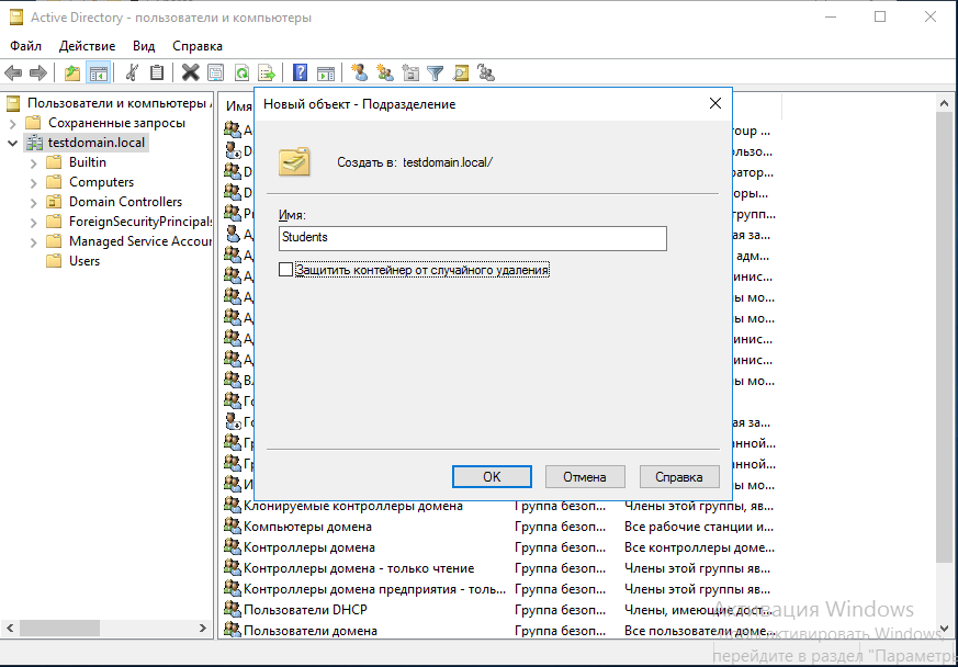 2.1 Откройте оснастку «Пользователи и компьютеры Active Directory». В домене testdomain.local создайте новое подразделение Students. Для этого щелкните правой кнопкой мыши по названию домена и выберите Создать → Подразделение (рисунок 2.1).