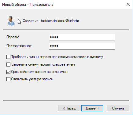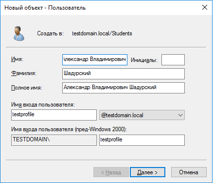 2.2 В подразделении Students создайте нового пользователя c учетной записью testprofile. При вводе реквизитов укажите свою фамилию и имя. На следующем шаге придумайте пароль для входа в систему (рисунок 2.2).