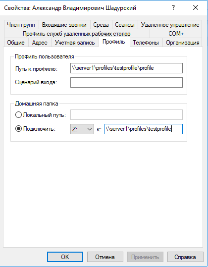 2.3 Откройте свойства созданного пользователя и на вкладке «Профиль» укажите путь к профилю и путь к домашней папке. Заполненные данные представлены на рисунке 2.3.