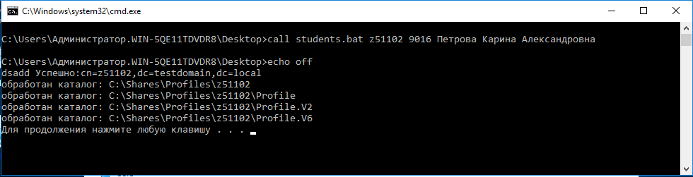 3.4 Запустите созданный вами файл students.bat, содержащий данные только для одного пользователя. Убедитесь в том, что команды выполнились успешно, и в Active Directory данные о пользователе отображаются корректно. Если тест прошел удачно, то добавьте в файл остальные записи и запустите его на выполнение. На рисунке 3.2 показан процесс создания одного пользователя.