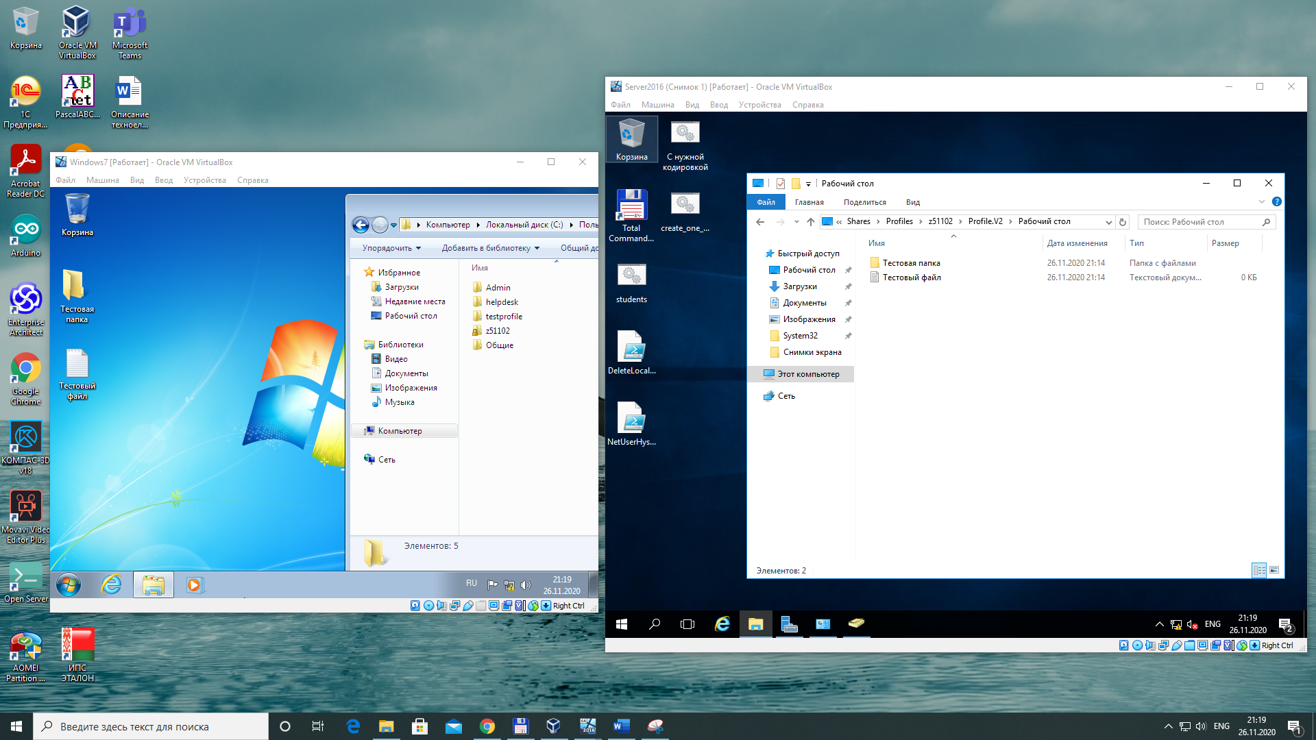 3.6 Выполните вход в домен с клиентского компьютера под одной из созданных вами учетных записей. Создайте на рабочем столе или в документах файл или папку. По аналогии с пунктом 2.4 убедитесь в синхронизации локальной копии профиля с серверной и в отсутствии ошибок при входе в систему и выходе из системы. Результат тестирования должен выглядеть следующим образом: