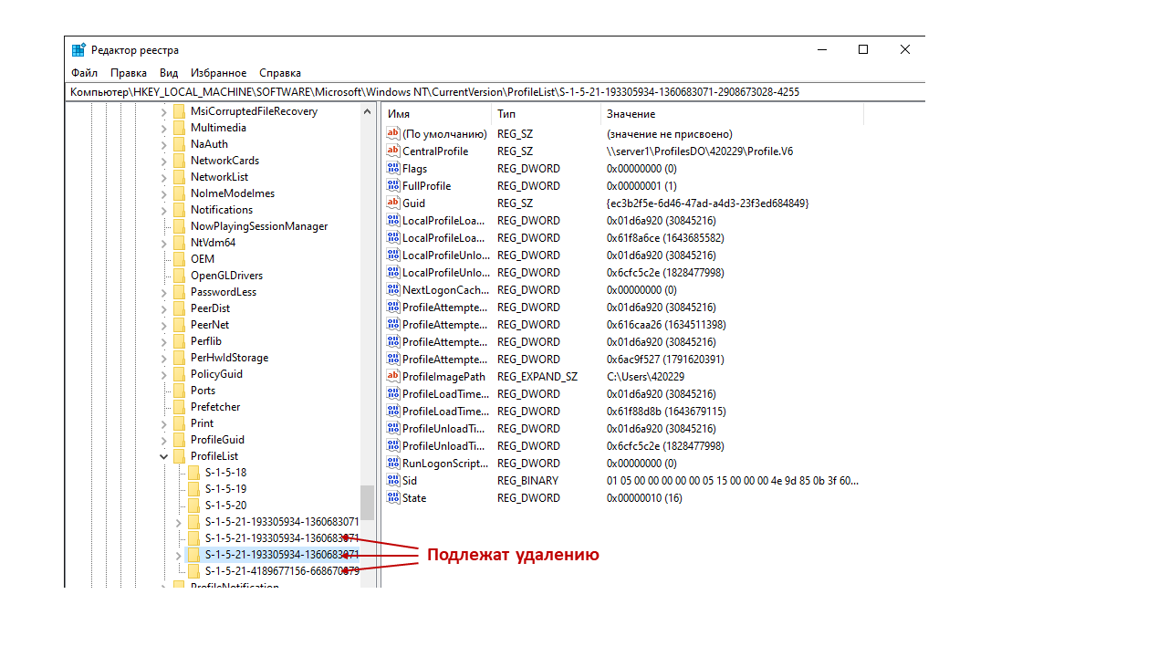 Если за одним компьютером-клиентом в сети работает большое количество пользователей, то со временем это приведет к накоплению их локальных копий профилей по адресу C:\Users. Это повлечет за собой уменьшение объема свободного дискового пространства. Следовательно, содержимое каталога C:\Users периодически необходимо очищать. Однако, если в компьютерах под управлением Windows XP можно просто удалить папки профилей, то на компьютерах с ОС Windows 7 и выше необходимо еще удалять идентификаторы пользователей в системном реестре по адресу: HKLM\SOFTWARE\Microsoft\Windows NT\CurrentVersion\ProfileList\ (рисунок 2.1). Для одного компьютера эта операция не займет много времени, но для большого числа компьютеров данный процесс целесообразно автоматизировать.