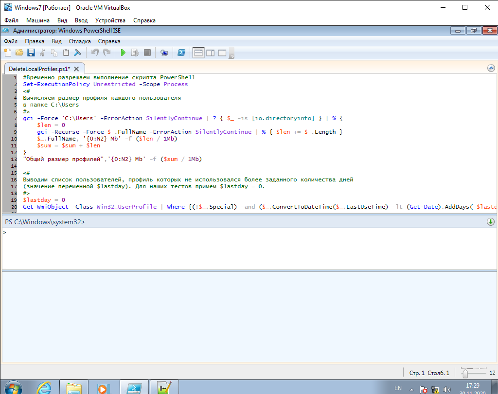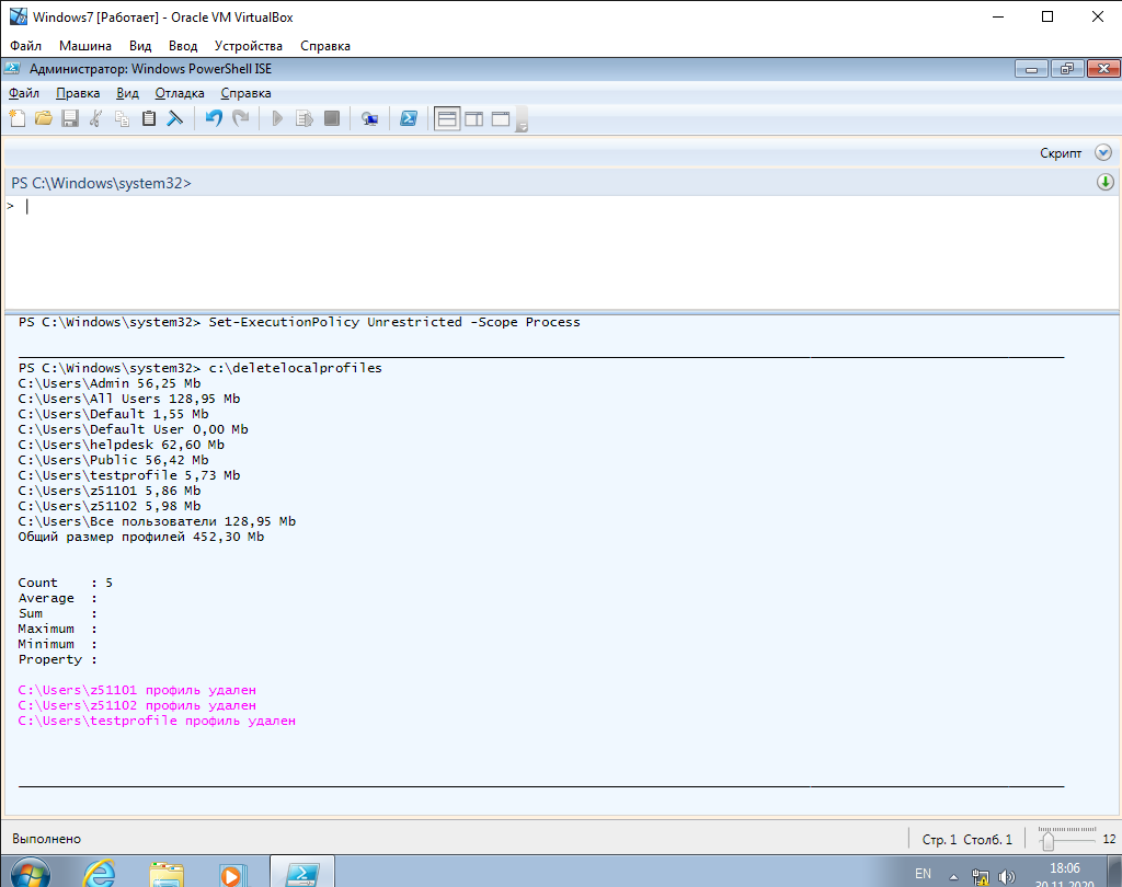 2.3 Сохраните и закройте скрипт, скопировав предварительно в буфер обмена строку, разрешающую выполнение скриптов PowerShell. Запустите заново PowerShell (или PowerShell ISE) от имени Администратора. В область команд вставьте скопированный фрагмент и нажмите Enter. Появится запрос об изменении политики разрешения выполнения скриптов. Необходимо ответить «Да (Y)». Затем ведите путь к скрипту (например C:\DeleteLocalProfiles.ps1) и нажмите Enter. Результат работы скрипта представлен на рисунке 2.3.