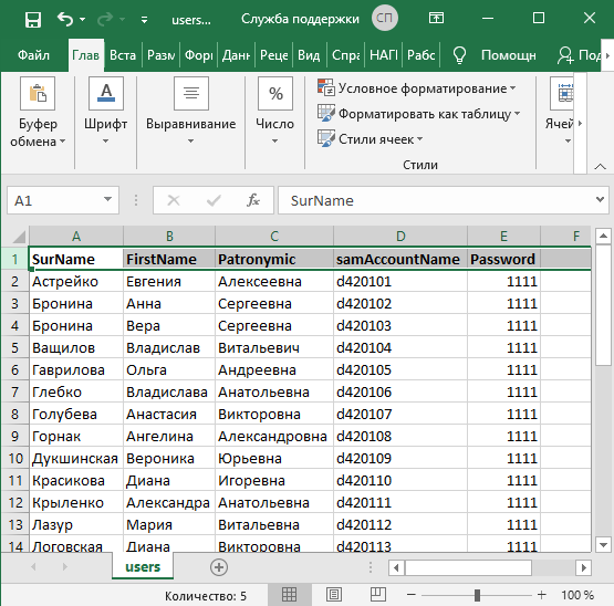 Вы можете использовать другие названия полей вместо предложенных. При этом не забудьте изменить соответствующие переменные в скрипте PowerShell. Можно также при необходимости добавить другие поля, например: адрес, телефон и т.д. Для этого укажите их в качестве значений соответствующих параметров команды New-ADUser.