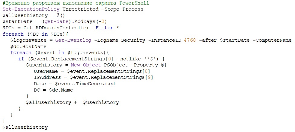3.2 Систематизируйте информацию их журналов Windows с помощью PowerShell. Для этого создайте скрипт и присвойте ему имя, например, NetUserHistory.