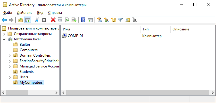 2.1 Перейдите в оснастку «Пользователи и компьютеры Active Directory» и в корне домена testdomain.local создайте подразделение MyComputers. Переместите в него из подразделения Computers объект, связанный с вашим компьютером-клиентом с Windows 7. Результат выполнения представлен на рисунке 2.1