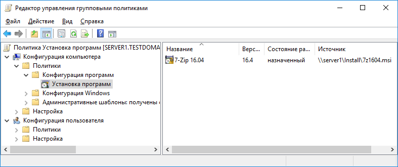 2.2 В оснастке управления групповыми политиками создайте новый объект GPO «Установка программ». Вызовите для него редактор управления политикой и в разделе «Конфигурация компьютера» - Политики - Конфигурация программ» выберите элемент «Установка программ». Создадим здесь новый пакет и свяжем с ним установку программы 7z. Метод развертывания установить «Назначенный». Результат выполнения представлен на рисунке 2.2.
