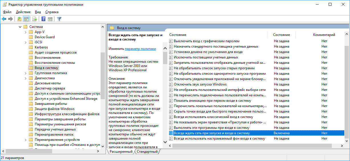 – Конфигурация компьютера - Политики - Административные шаблоны - Система - Вход в систему - Всегда ждать сеть при запуске и входе в систему – Включена (рисунок 2.5);