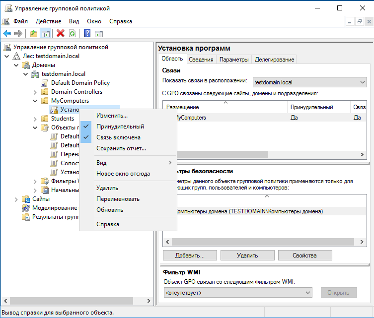 2.6 В управлении групповой политикой свяжите с подразделением «MyComputers» настроенный ранее объект групповой политики «Установка программ» и выставьте параметр «Принудительный» (рисунок 2.6).