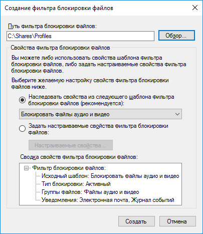 Рисунок 1.1 – Создание фильтра блокировки файлов на основе шаблона
