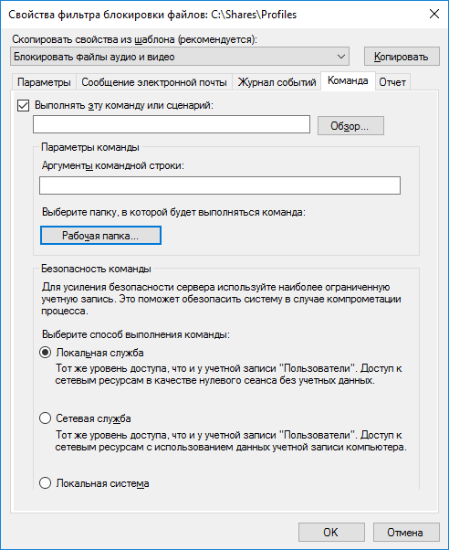2.1 Откройте свойства созданного фильтра блокировки для медиафайлов. Перейдите на вкладку «Команда». Здесь можно указать программу или скрипт, который запустится при попытке сохранить неразрешенный файл (рисунок 2.1)