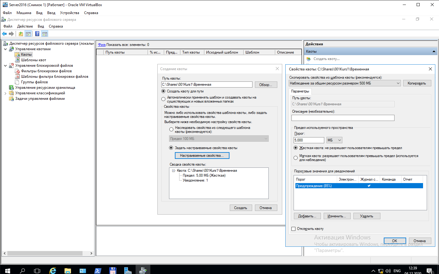 3.2 Создайте квоту на папку «001Kurs1\Временная» и установите для нее квоту в диапазоне 5 – 10 Мб. Настройте запись предупреждения в журнал событий при достижении отъема папки в 85% от максимально возможного. Возможный вариант настроек приведен на рисунке 3.1.