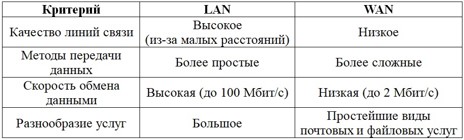 - Практически одинаковый спектр услуг, оказываемых LAN и WAN.
