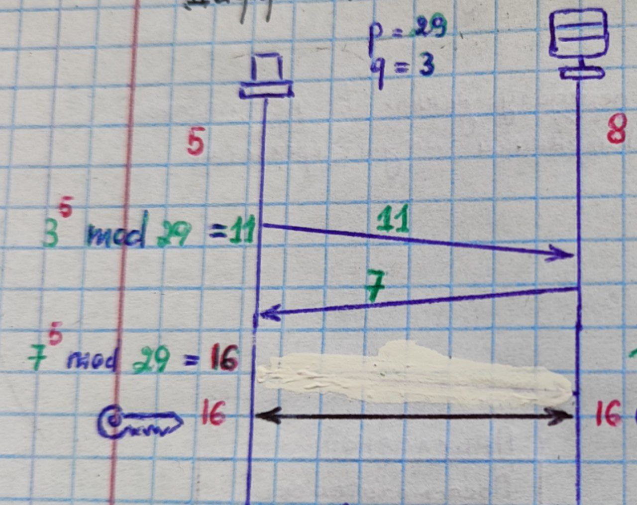 Перед началом обмена К и С договоренность о двух числах. Числа передаются открыто. Затем К и С генерирует два случайных числа, которые нельзя передавать по открытым каналам.
