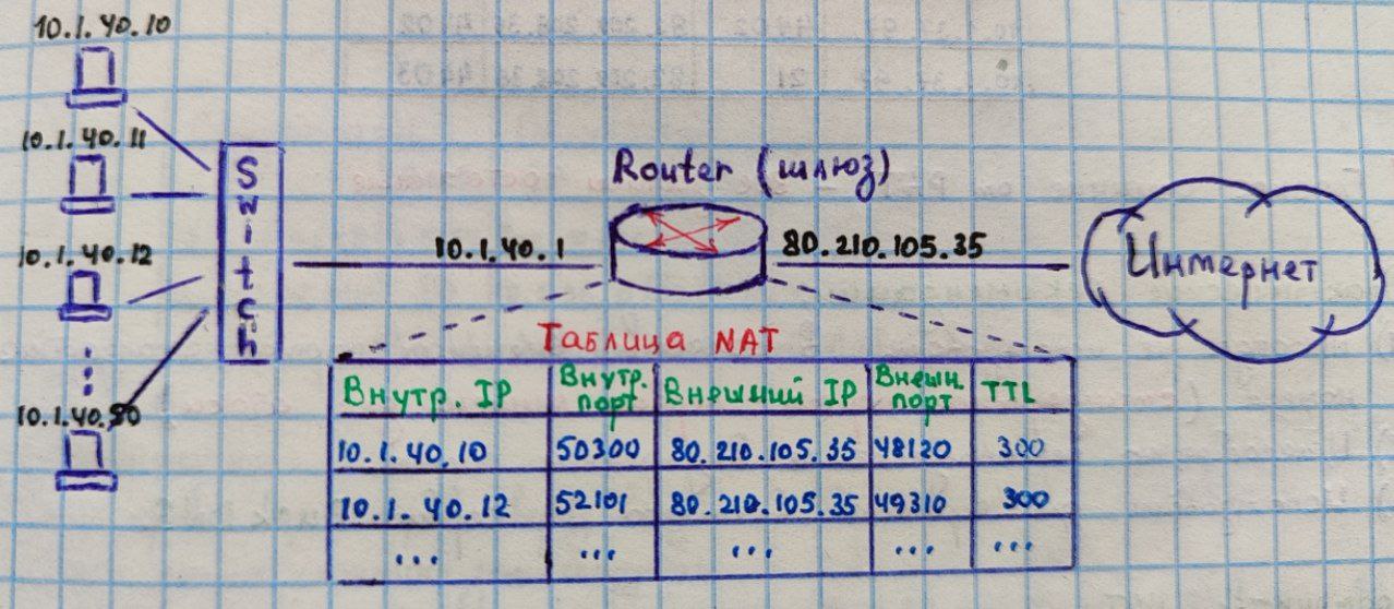NAT(Network Address TransPation) - технология преобразования IP-адресов внутренней (частной) сеть в IP-адреса внешней сети (Интернет)